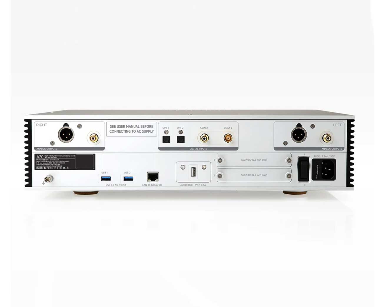 Der Aurender A20 verfügt über hochwertige analoge Ausgänge und kann direkt an einen Vor- oder Vollverstärker angeschlossen werden.