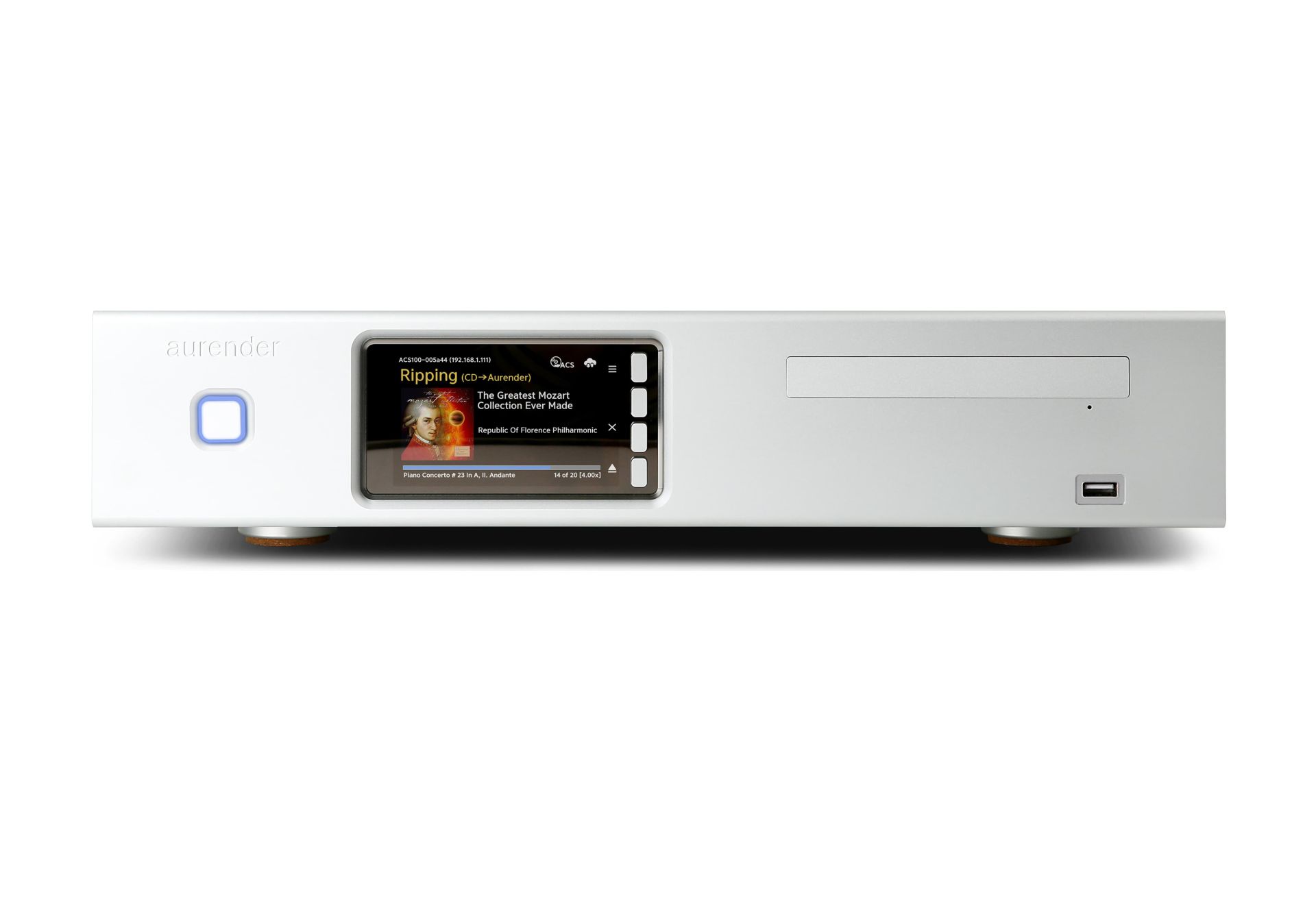 Im Mittelpunkt steht das integrierte CD-ROM-Laufwerk für One-Touch-CD-Ripping. CDs werden wahlweise in FLAC, WAV, MP4 oder AIFF gerippt. Metadaten und Cover-Art werden automatisch abgerufen und können in einer benutzerdefinierten Ordnerstruktur gespeichert werden.