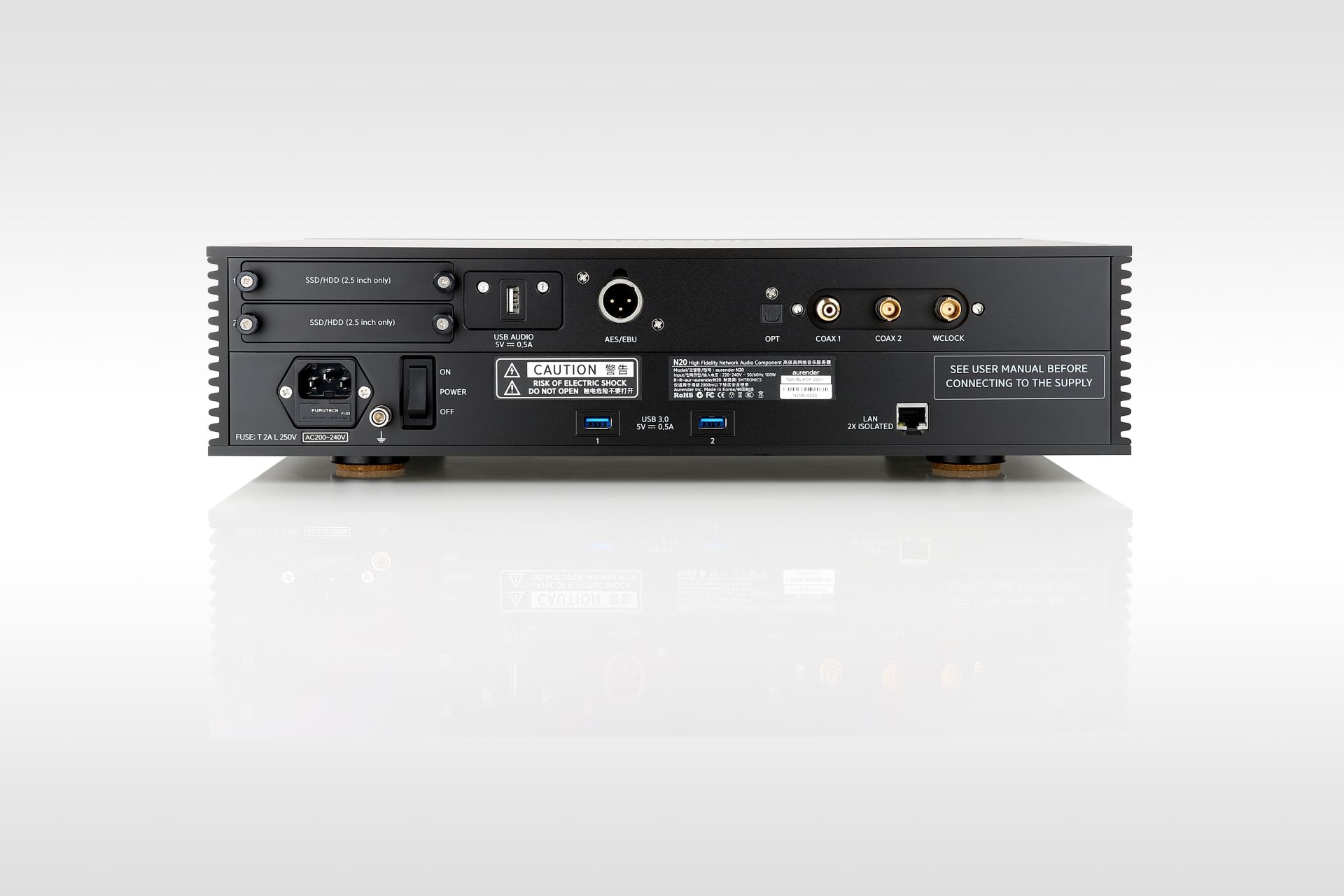 Der Aurender N20 verfügt über zwei leere 2,5-Zoll-Laufwerksschächte, die vom Benutzer mit HDD- oder SSD-Laufwerken bestückt werden können. Dadurch lässt sich der interne Speicher exakt an den individuellen Bedarf anpassen.