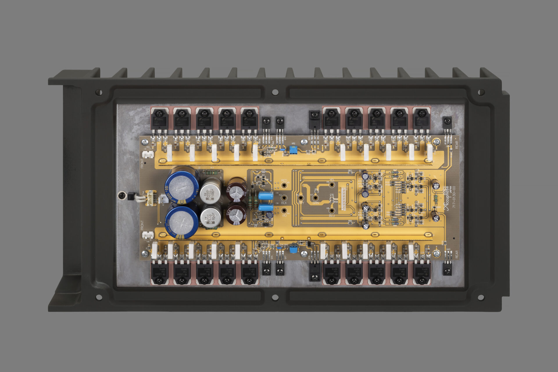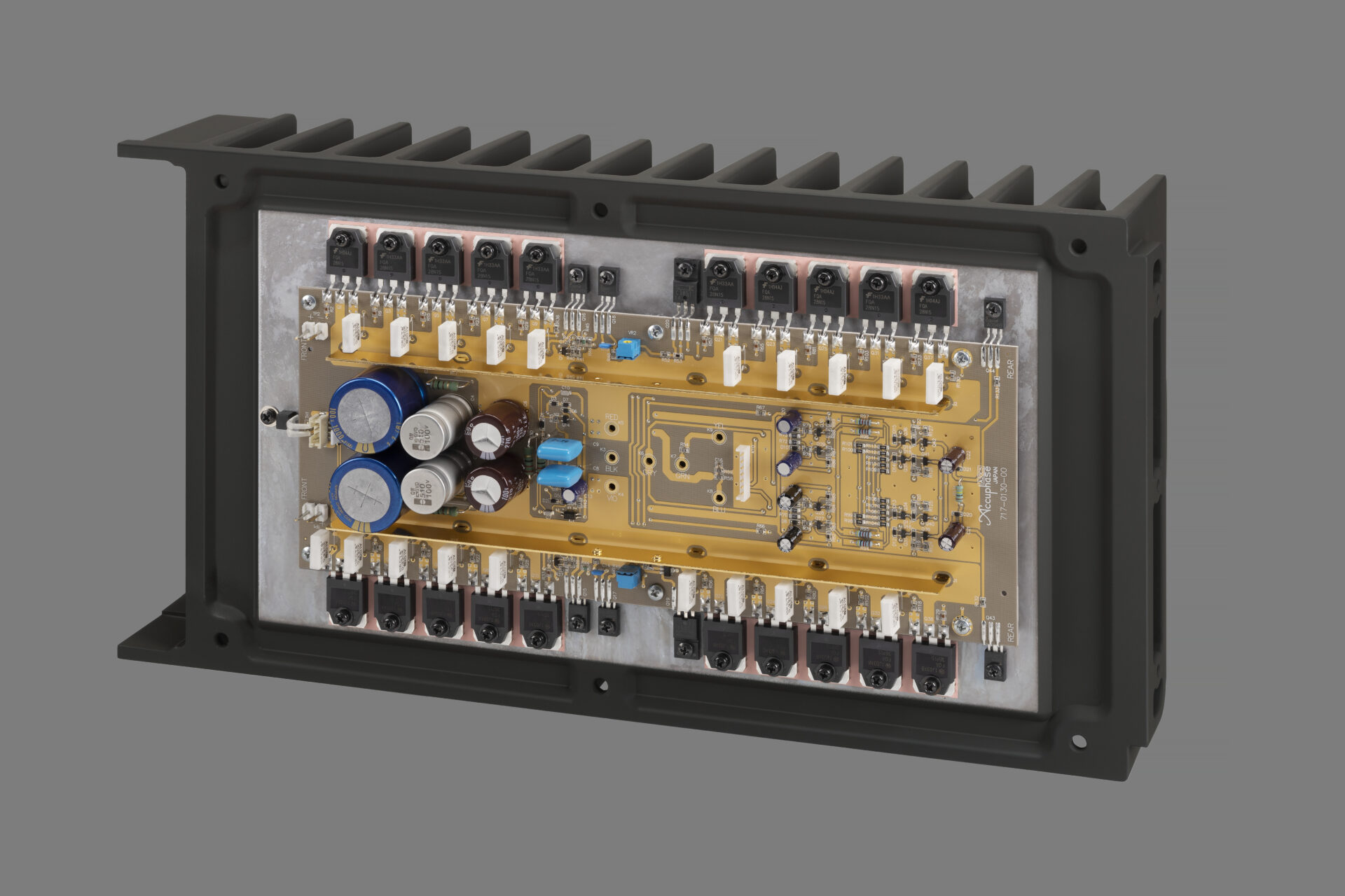 Zusätzlich kommen nochmals leistungsstärkere MOS-FET-Schalter in der Ausgangsstufe zum Einsatz. In Verbindung mit einem extrem hohen Dämpfungsfaktor von 1.000 werden die gegenelektromotorischen Kräfte der Lautsprecherchassis perfekt kontrolliert – ein entscheidender Vorteil für präzisen Bass und exaktes Timing.
