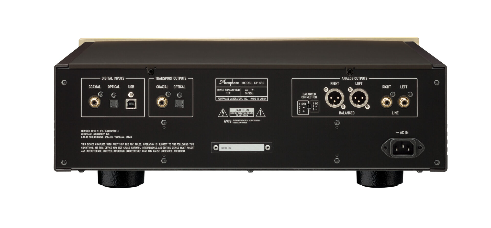 Das Gehäuse des Accuphase DP-450 ist insgesamt auf Resonanzarmut und Stabilität ausgelegt. Die massive Bauweise trägt entscheidend dazu bei, mechanische Störeinflüsse zu minimieren und eine ruhige, entspannte Hörsituation zu schaffen – ein wesentlicher Faktor für langfristigen Hörgenuss.