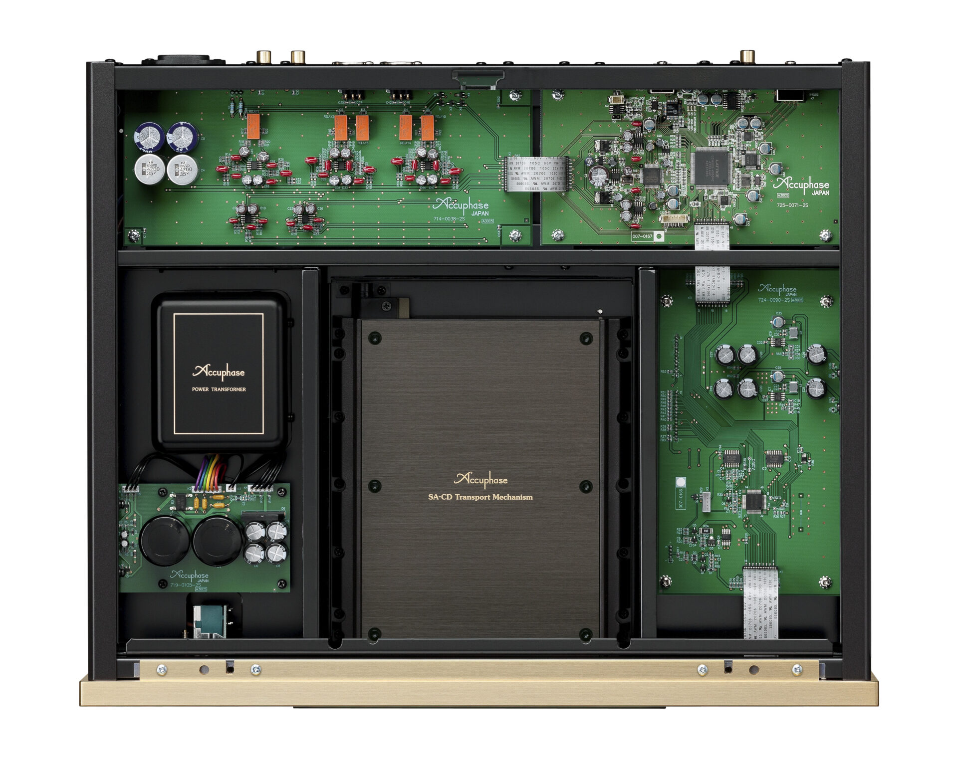 Das Gehäuse des Accuphase DP-570 wurde äußerst verwindungsfest aufgebaut. Massive innere Versteifungen sowie eine dreilagige Bodenplatte sorgen für eine stabile, resonanzarme Grundstruktur. Eine neu entwickelte, größere Traverse ist über vier elastische Butyl-Dämpfer mit dem Disc-Lesemechanismus verbunden.