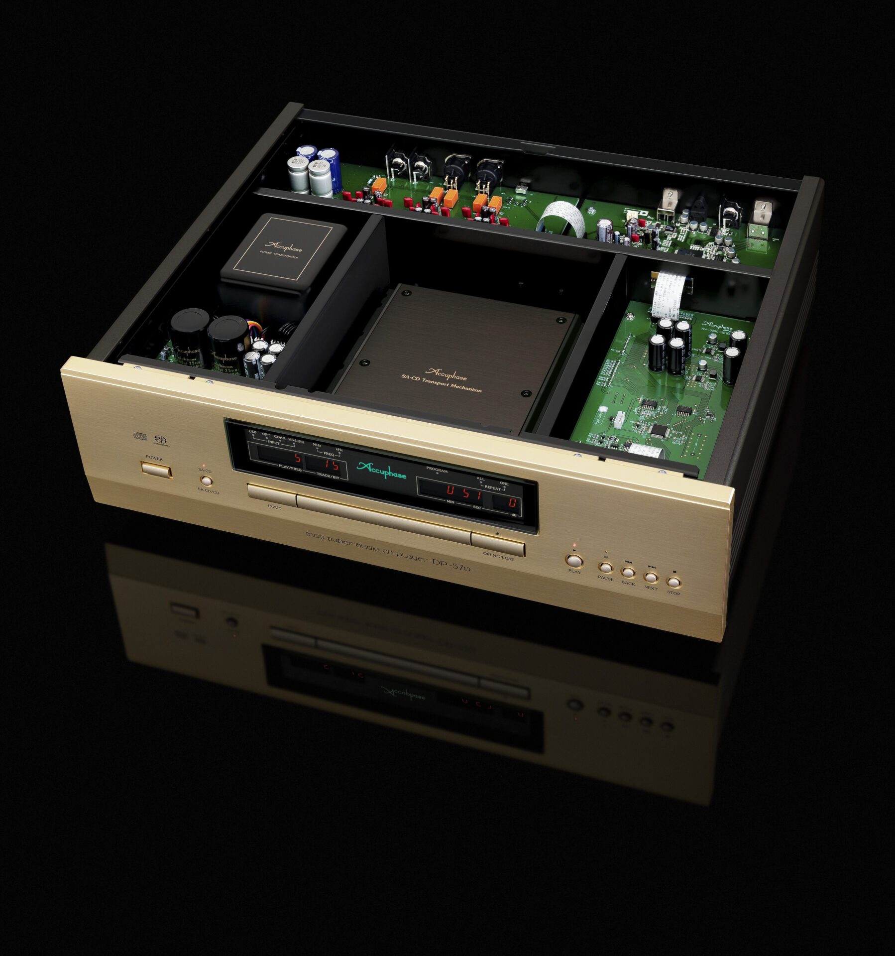 Ein zentrales Merkmal des Accuphase DP-570 ist sein massives SA-CD/CD-Laufwerk der neuesten Generation. Dieses wurde mit einem besonders niedrigen Schwerpunkt konstruiert, um Resonanzen und mechanische Störeinflüsse wirkungsvoll zu minimieren. Die Laufruhe und Lesesicherheit konnten gegenüber früheren Generationen nochmals deutlich verbessert werden.