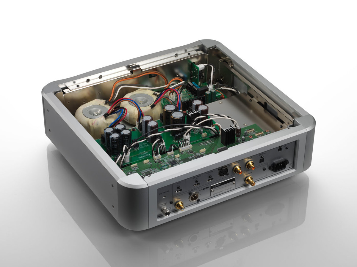 Besonderes Augenmerk wurde auch auf die Chassiskonstruktion jeder Einheit gelegt, mit einem stabilen, robusten Gehäuse aus dicken Aluminiumplatten, um eine gründliche Vibrationskontrolle zu gewährleisten. Das untere Chassis, an dem jede Schaltungskomponente befestigt ist, hat eine mehrschichtige Struktur aus mehreren Stahlplatten. Der Leistungstransformator und andere Komponenten sind auf separaten Schichten befestigt und in einer dreidimensionalen Anordnung angeordnet, um gegenseitige Störungen zwischen den einzelnen Komponenten zu verhindern. Der ursprüngliche Pinpoint-Fuß* von Esoteric, der einen Dorn und eine Untertasse integriert, wurde durch einen neuen Fuß ersetzt, der nicht mit dem unteren Chassis verschraubt ist, sondern im eingebauten Zustand durch das Gewicht des Chassis an Ort und Stelle gehalten wird. Durch die Vermeidung der Spannungskonzentration, die durch das Einschrauben des Pinpoint-Fußkörpers in die große Oberfläche des unteren Chassis entsteht, entsteht ein offenerer Klang.