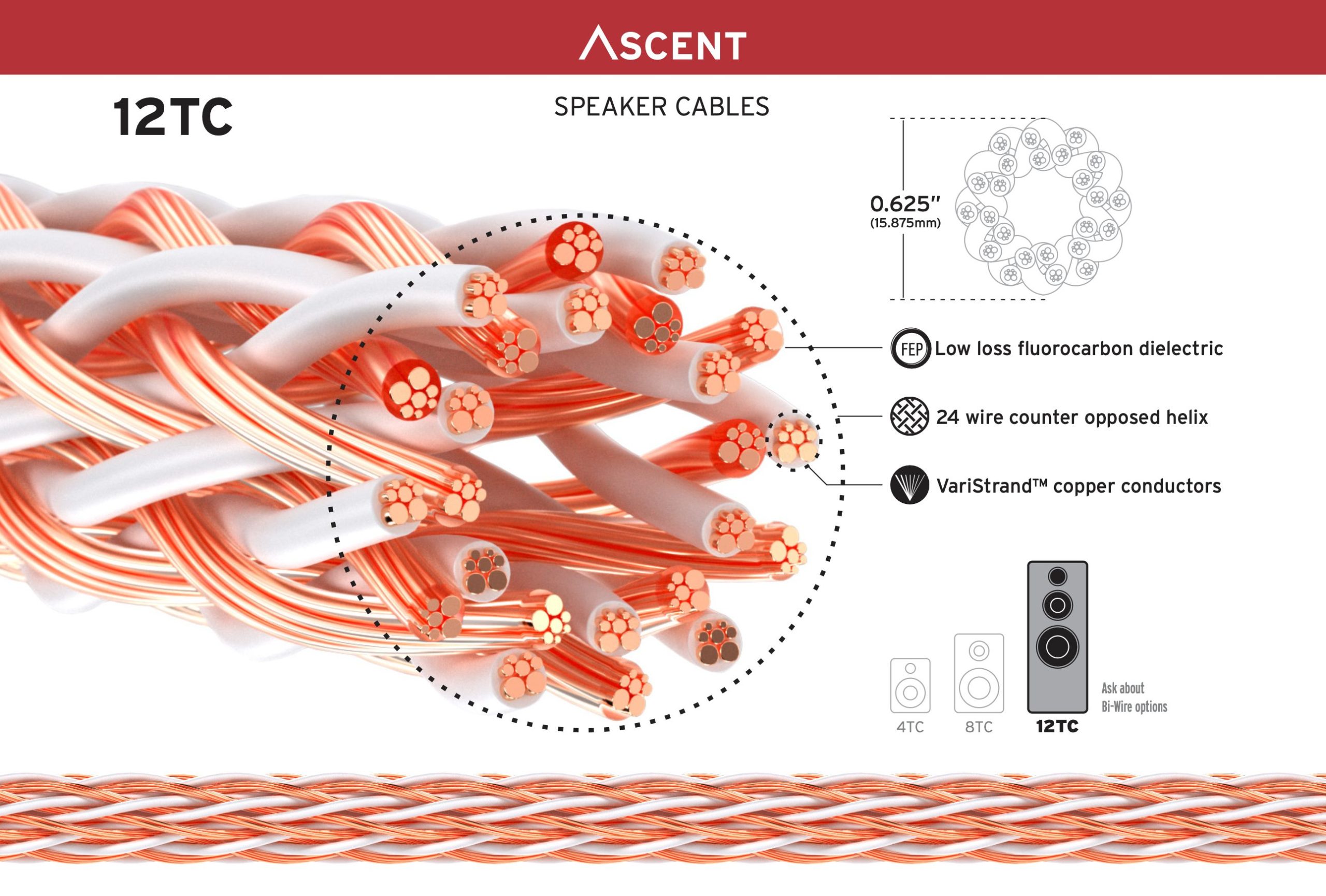 Was als praktische Lösung für die zahlreichen 4TC/8TC-Bi-Wire-Anfragen begann, wurde schließlich als 12TC entwickelt, um anspruchsvolle Lautsprecherlasten mit hoher Verstärkerleistung zu versorgen. Das größere 24-adrige Geflecht des 12TC vereint das Beste aus beiden Welten: die Feinheit des 4TC und die größere Wucht und die Präsenz des 8TC.