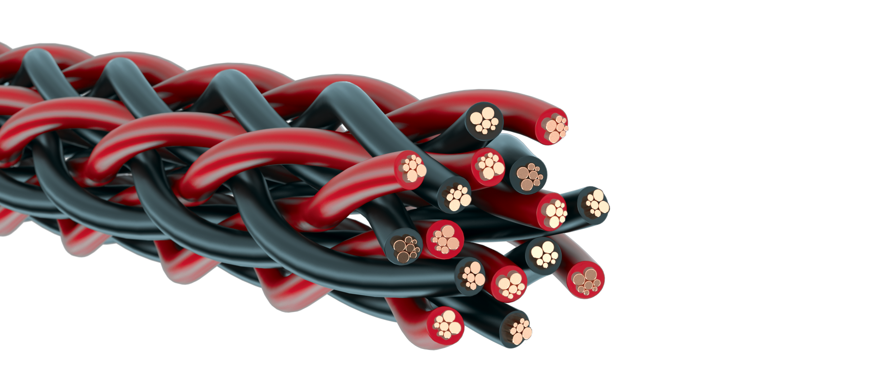 Kombination aus acht 0,87 mm2-Litzen ≈ 6 mm2 pro +/- Strang.