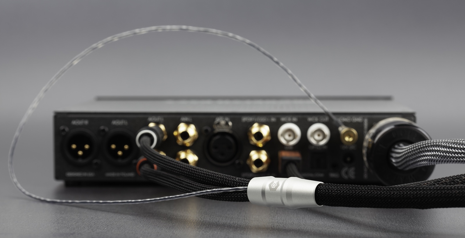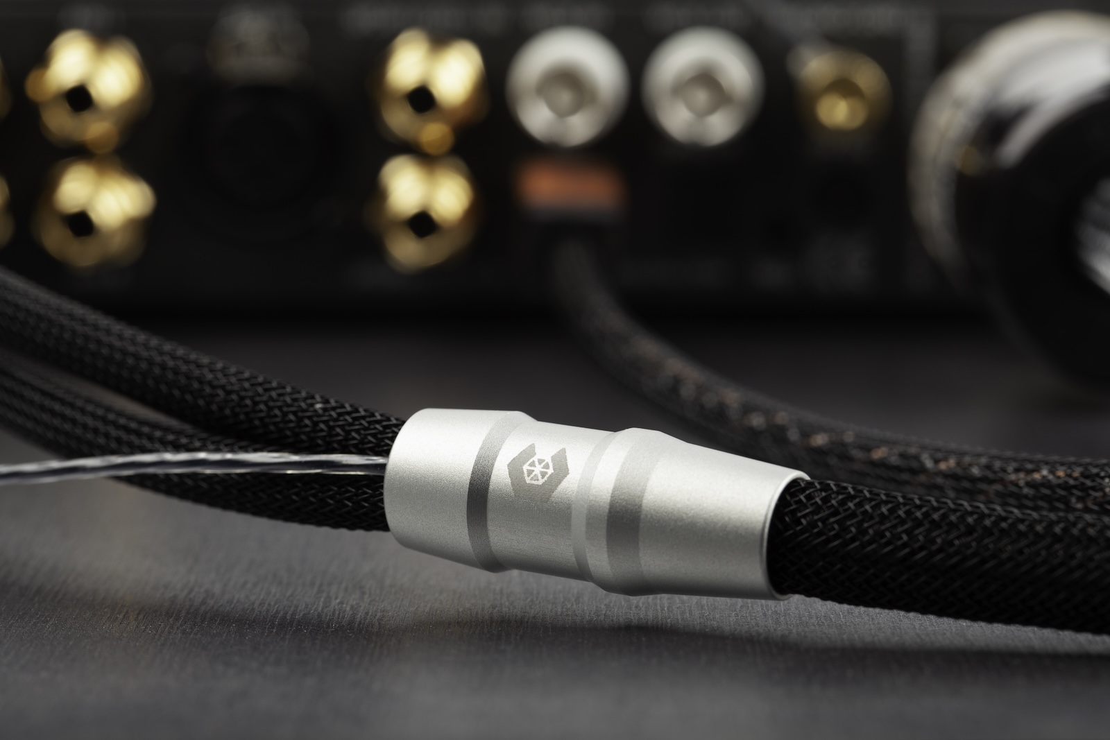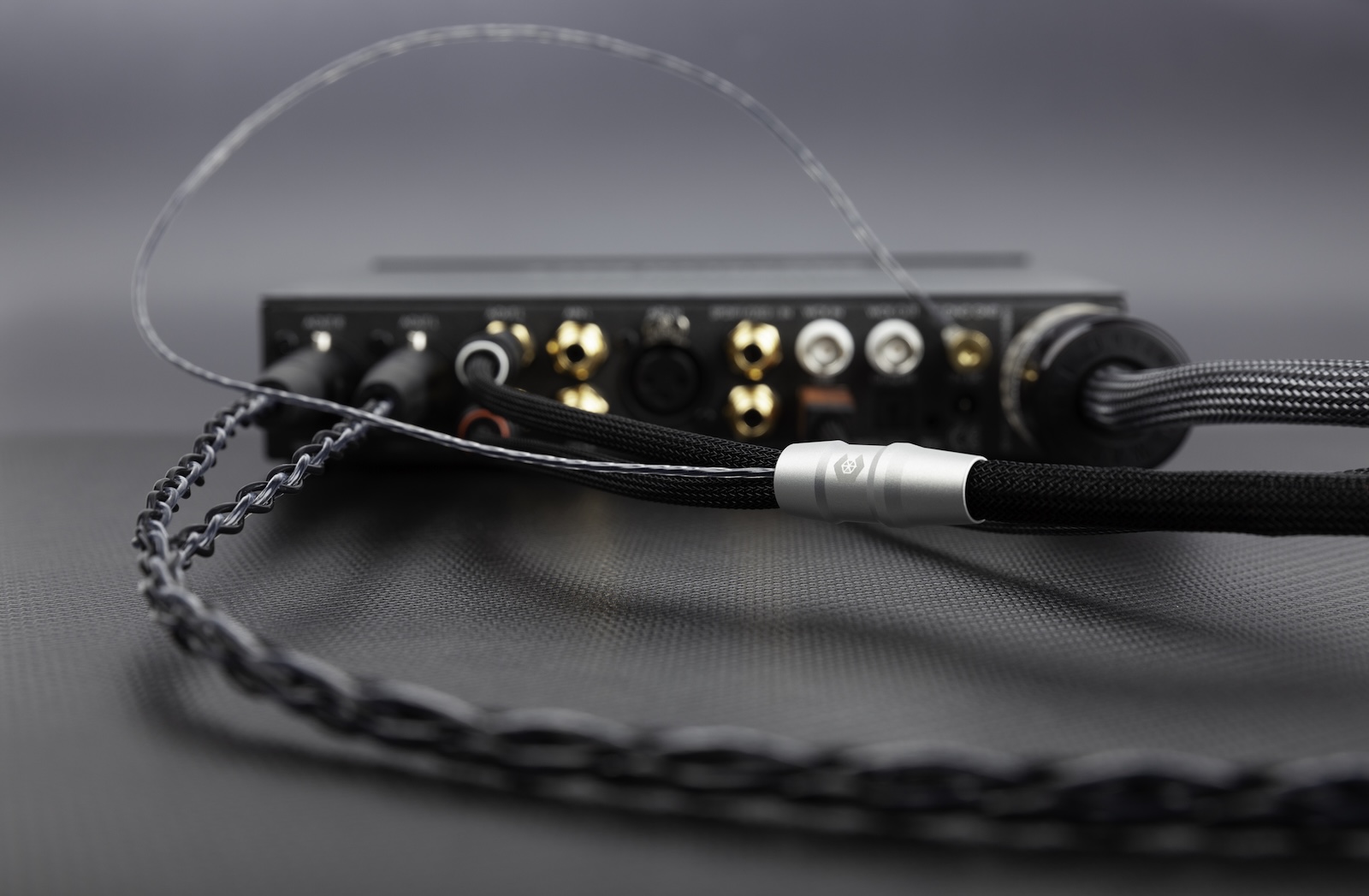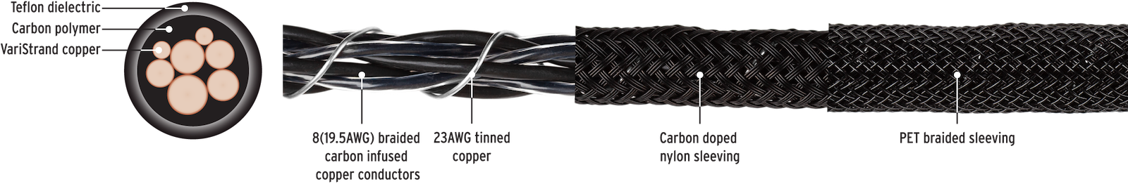 Ein unisolierter, verzinnter Kupferdraht mit 0,256 mm² Querschnitt wird in präziser Handarbeit um einen geflochtenen 8-adrigen Kern gewickelt. Diese Schicht zieht sich lückenlos bis zu den Anschlüssen und gewährleistet so eine durchgängige Abschirmung. Über die gesamte Kabellänge liegt der Draht in direktem Kontakt mit der kohlenstoffdotierten Nylonummantelung und ist schließlich mit der Grundplatte verbunden – für eine durchdachte, vollständige Schutzarchitektur.