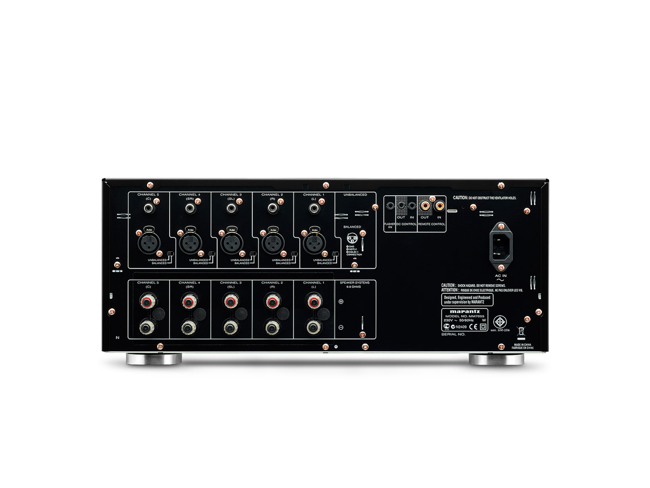 Der MM7055 unterstützt sowohl symmetrische Eingänge als auch unsymmetrische Cinch-Eingänge. Für eine einfache und flexible Konnektivität können Sie für jeden Kanal individuell den jeweiligen Eingangstyp wählen. Hochwertige, vergoldete 4-Wege-Lautsprecheranschlüsse sorgen für eine stabile Verbindung mit den Lautsprecherkabeln Ihrer Wahl.