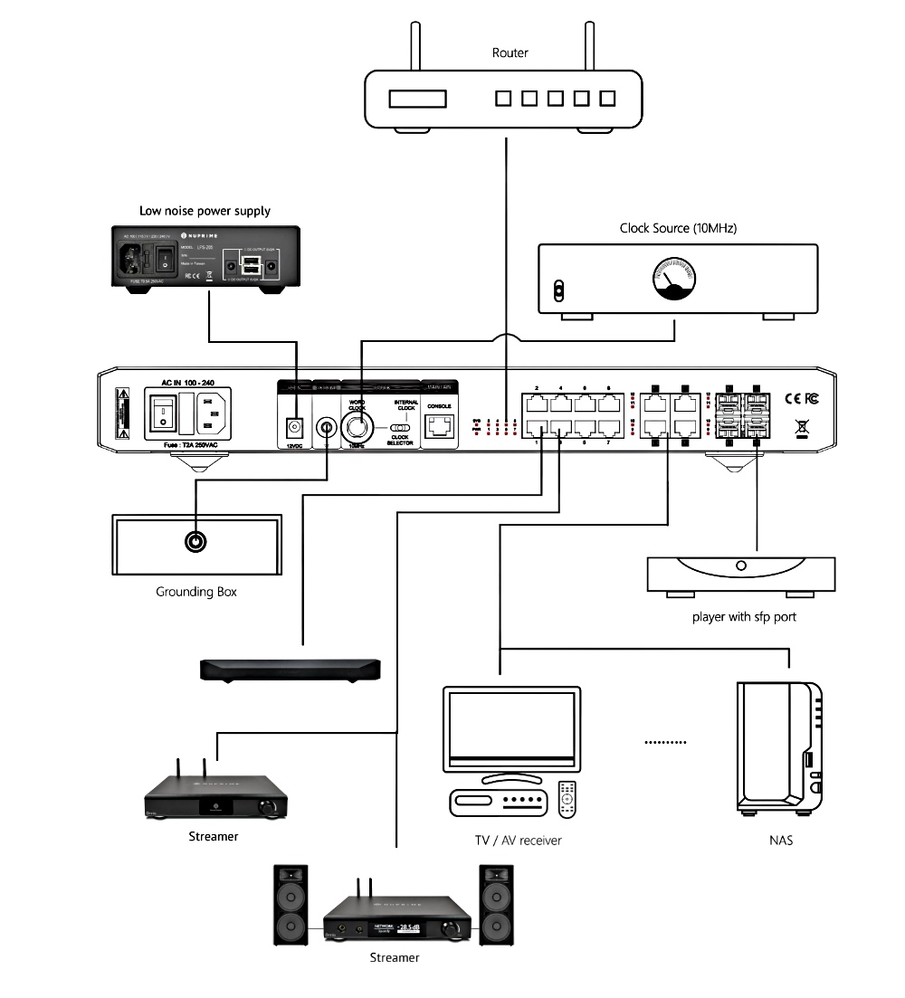 Der SW Ultimate ist ein High-End-Layer-3-Gigabit-Netzwerk-Switch mit 12 Ports und 4 gemeinsam genutzten Glasfaser-SFP-Ports, der speziell für Musikliebhaber entwickelt wurde, die ein dediziertes „HiFi-Ökosystem“ aufbauen und höchste Klangtreue erreichen möchten. Er verbessert die Netzwerkleistung, indem er das Signalrauschen durch NuPrimes extrem rauscharme Stromversorgung und eine angepasste TCXO-Uhr minimiert. Diese Konfiguration gewährleistet präzise Netzwerksignale für eine stabile und zuverlässige Musikdatenübertragung und verbessert das Hörerlebnis deutlich.