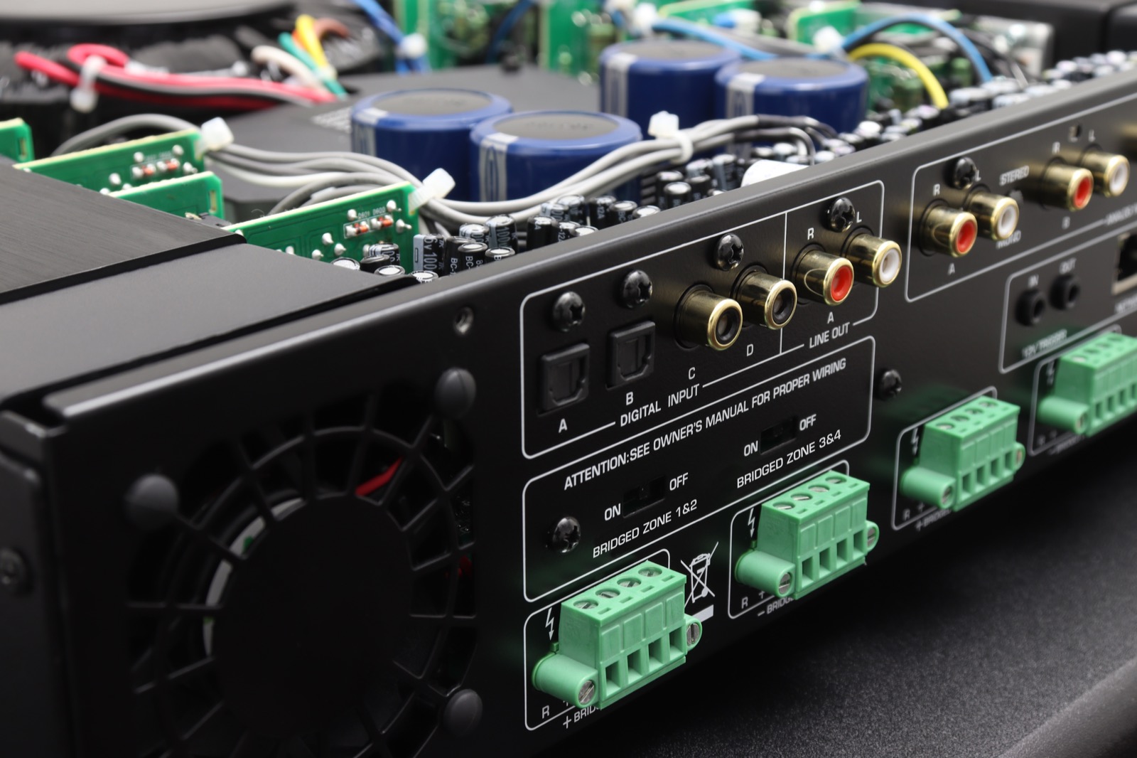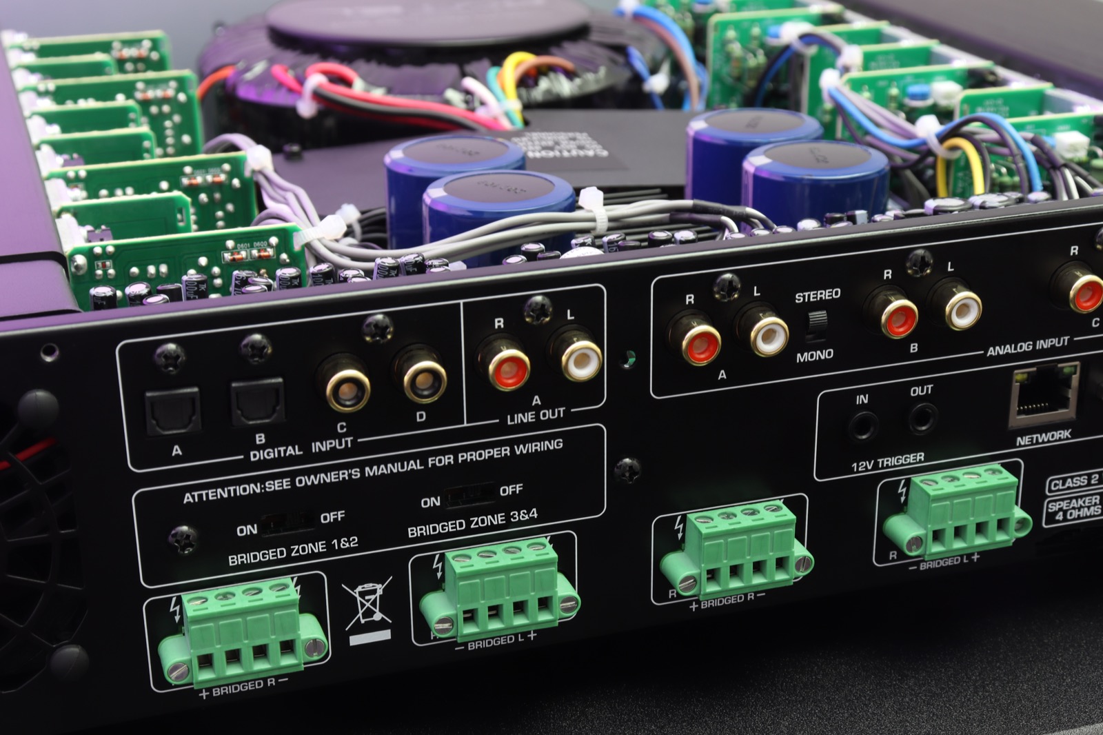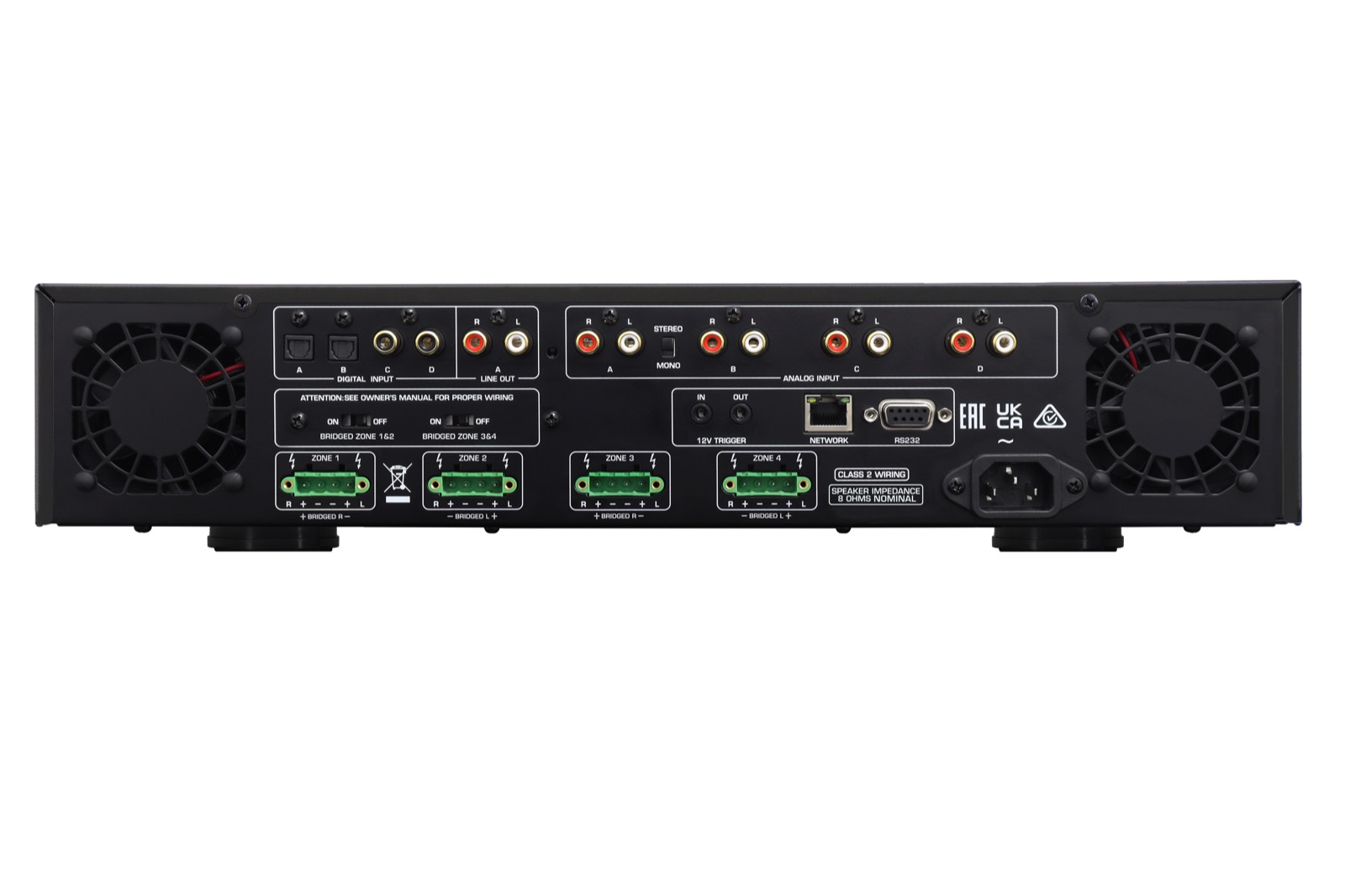 Die Rotel C8+ AV-Endstufe verfügt über vier analoge Hochpegeleingänge sowie vier digitale Eingänge. Diese Eingänge können flexibel auf alle Kanäle beziehungsweise Zonen geroutet werden.