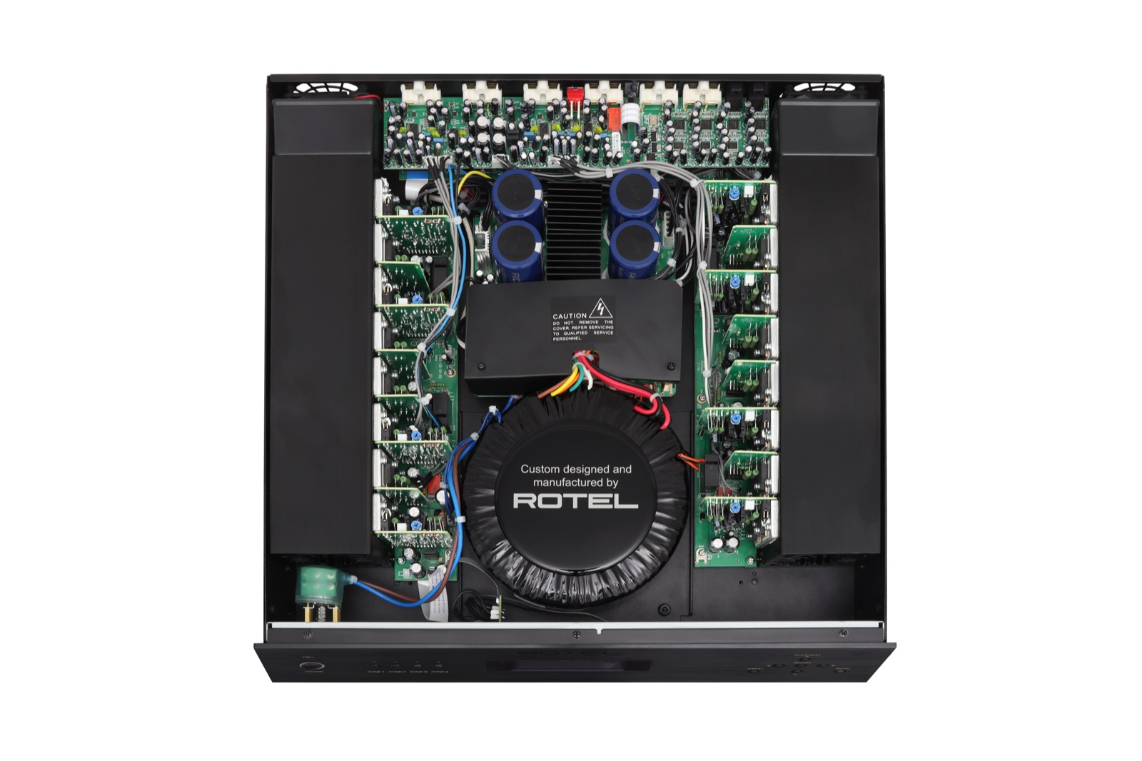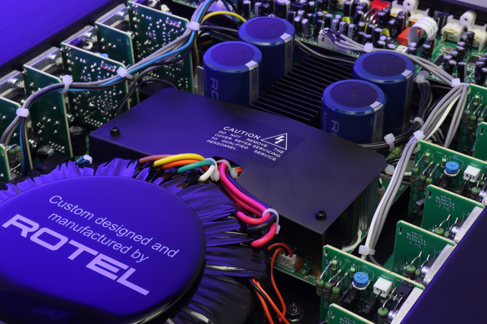 Ein zentrales Qualitätsmerkmal der Rotel C8+ AV-Endstufe ist der im eigenen Haus gefertigte, überdimensionierte Ringkerntransformator. Dieser versorgt insgesamt 32 Ausgangskomponenten mit stabiler Energie.