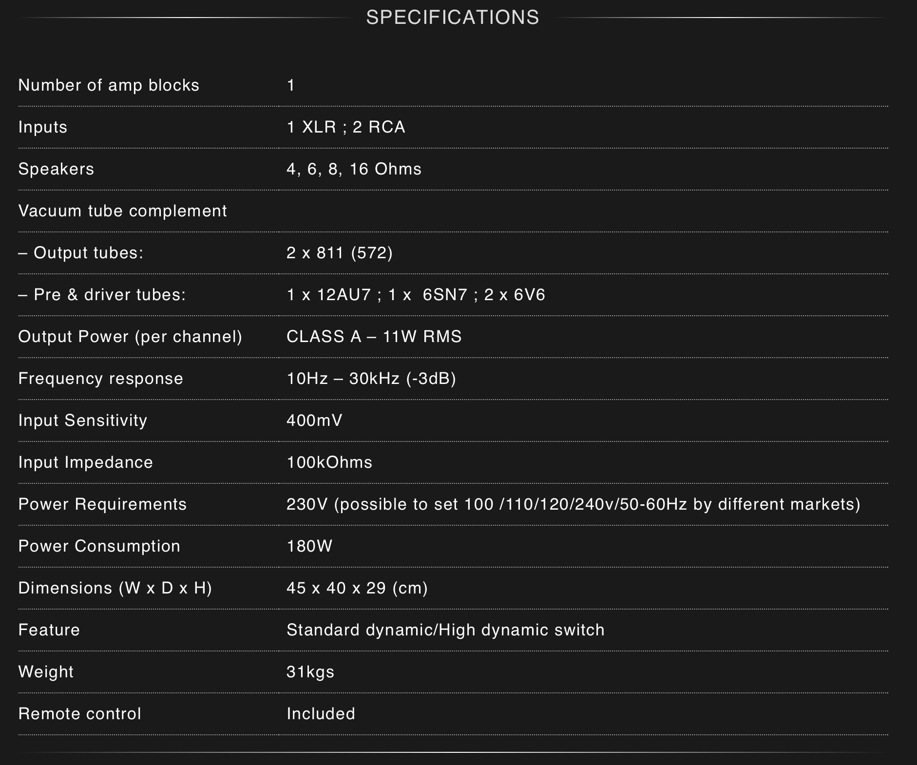 Der Mitteltonbereich ist warm, sehr weich und emotional. Der Bass ist klar, kohärent und tief. Die Kombination mit den Vorstufenröhren 12AU7 trägt zu einem sehr weichen, geschmeidigen und verführerischen Klang bei.