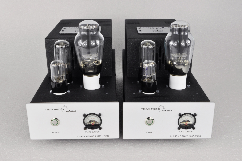 Single Ended Class-A Trioden-EndstufeDie Achilles Monoblöcke verstärken mit der legendären 300B Triode und liefern 8 Watt Ausgangsleistung. Die trickreiche einstufige Vorstufe mit 6SL7 als Verstärker und EL34 (oder 6L6) als Arbeitswiderstand sorgt für einen ultrakurzen Signalweg mit nur 2 Stufen. Dies ist bei der typisch für SET-Verstärker gegenkopplungsfrei ausgeführten Schaltung ein wichtiges Plus. Die Röhren sind paarweise selektiert. Der aufwändig mehrfach geschachtelte Übertrager wurde nochmals überarbeitet und bietet hohe Bandbreite bei deutlich verbesserter Feinauflösung. Ein eingebautes Milliampere-Messgerät zeigt den Ruhestrom durch die Endröhre an, WBT Nextgen Polklemmen dienen dem Lautsprecheranschluss. Auch optisch legt Tsakiridis nach: Neu ist die in Deutschland gefertigte, eloxierte Aluminium-Frontplatte, eine Röhrenabdeckung mit Plexiglasfront und die nun anthrazit gehaltene Trafoabdeckung mit aufwändig gelasertem Typenschild. Das trotzdem der Preis nur knapp über 2000 Euro pro Paar liegt, macht die Achilles zum „best-buy“ in Sachen Triodenverstärker.